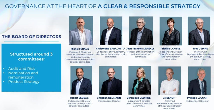 Governance lies at the heart of a clear and responsible strategy, structured around a clear separation of responsibilities between: <br/><br/> The Board of Directors<br/> Chaired by Michel Feraud, the Board approves the overall strategy proposed by Executive Management.<br/><br/> The Executive Committee<br/> Led by Hélène Thomas, it is responsible for overseeing Provepharm’s day-to-day operations.